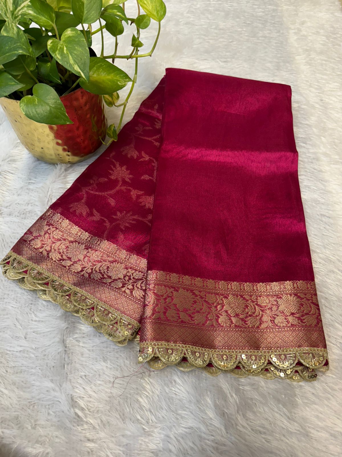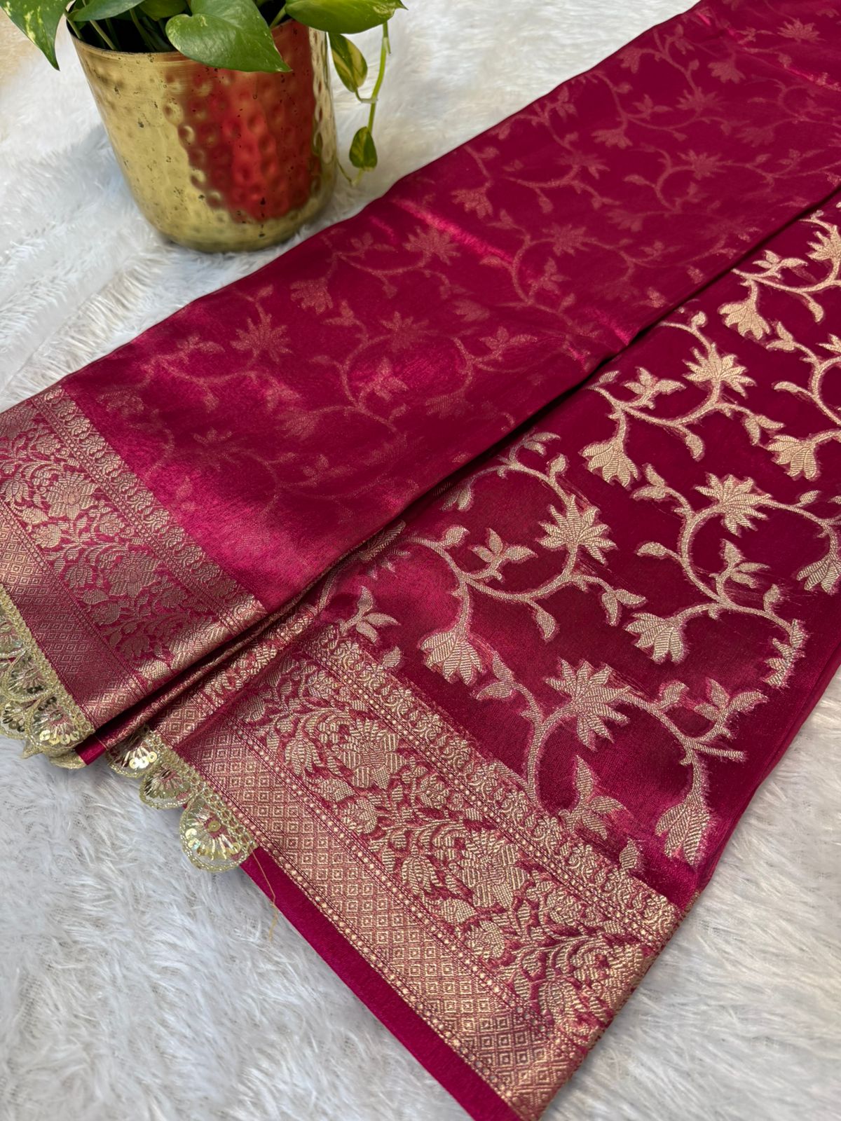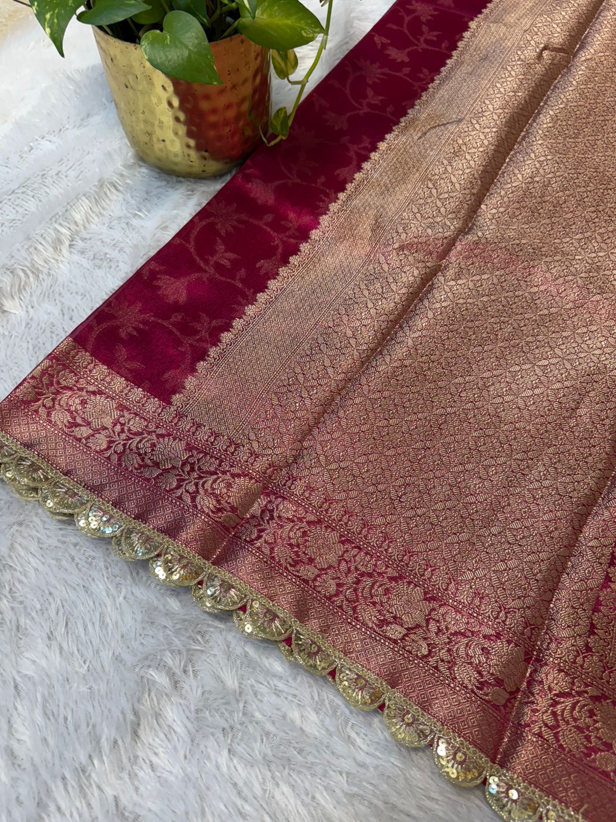 Exquisite Banarasi pink saree featuring elegant gold lace detailing along the borders. The rich pallu showcases traditional craftsmanship with intricate weaving patterns. Complemented by a matching pink blouse with sophisticated jal design. This authentic handloom piece exemplifies the timeless artistry of Varanasi's textile heritage, perfect for special occasions and celebrations.