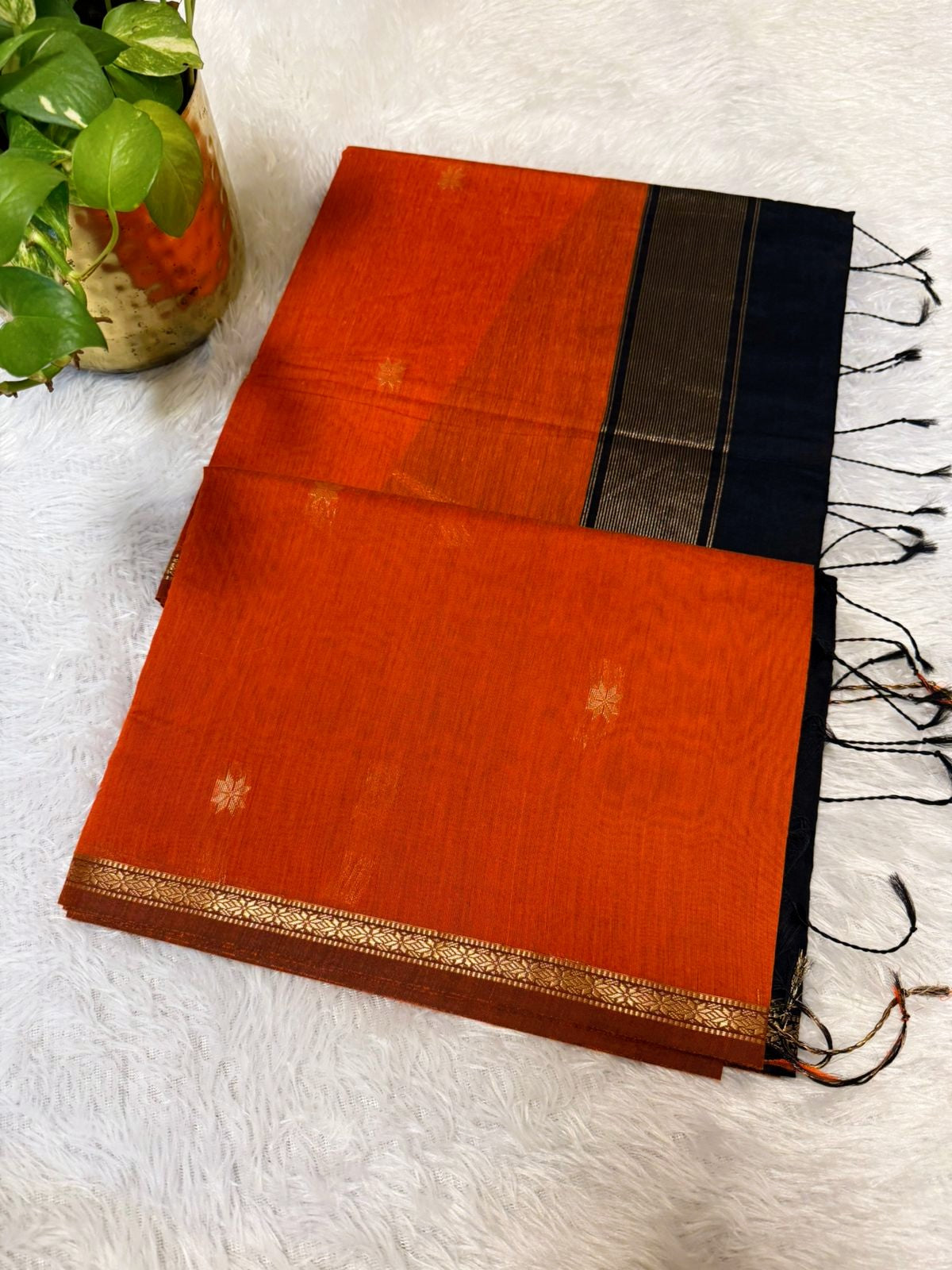 Saffron Maheshwari Cotton Silk Saree with Black pallu