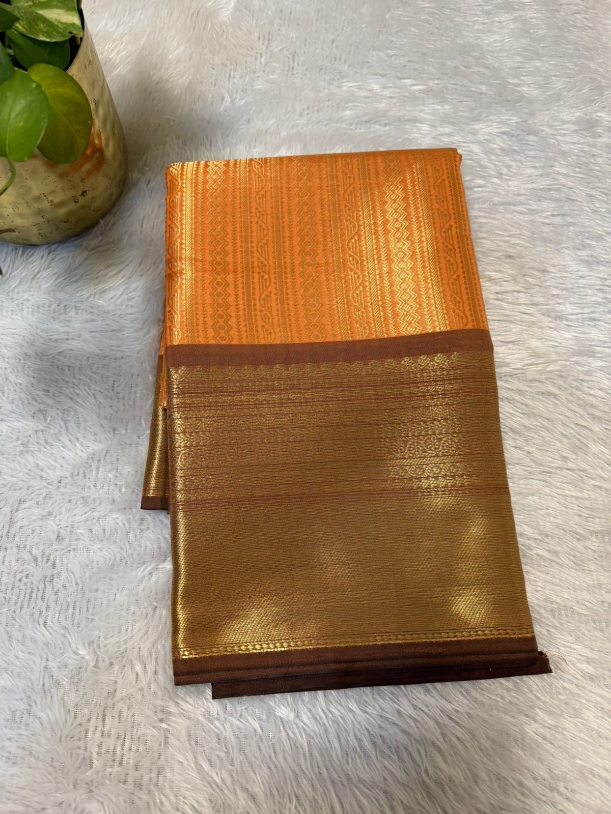Exquisite Tissue Silk saree featuring a harmonious blend of peach and brown hues, meticulously enhanced with intricate gold zari work throughout the fabric. The lightweight texture offers elegant draping while the metallic embellishments create a sophisticated sheen that catches light beautifully. Perfect for special occasions where refined luxury is essential.